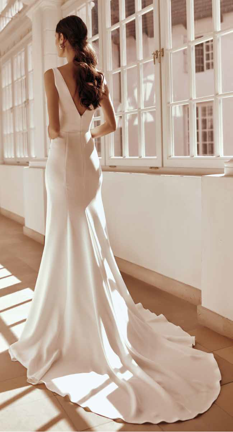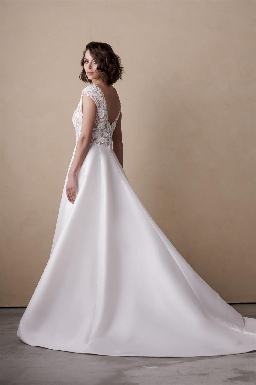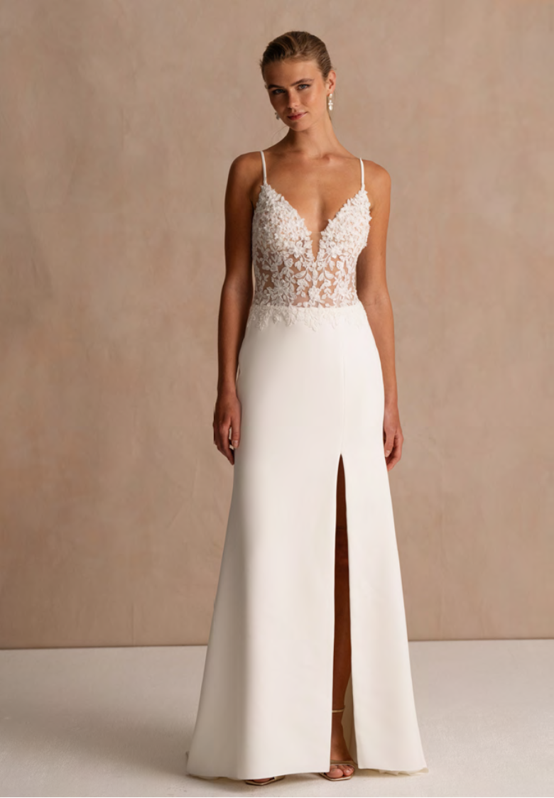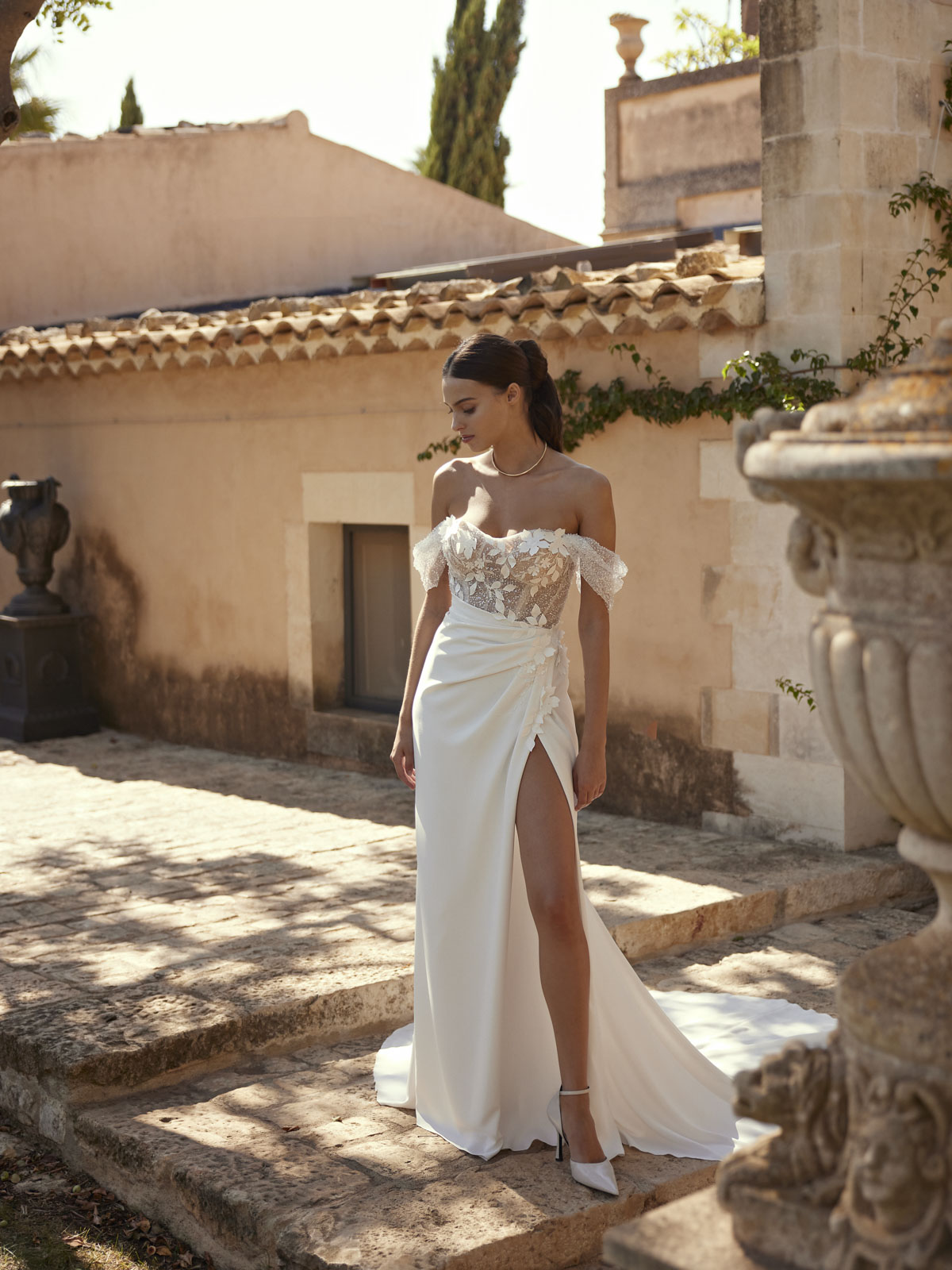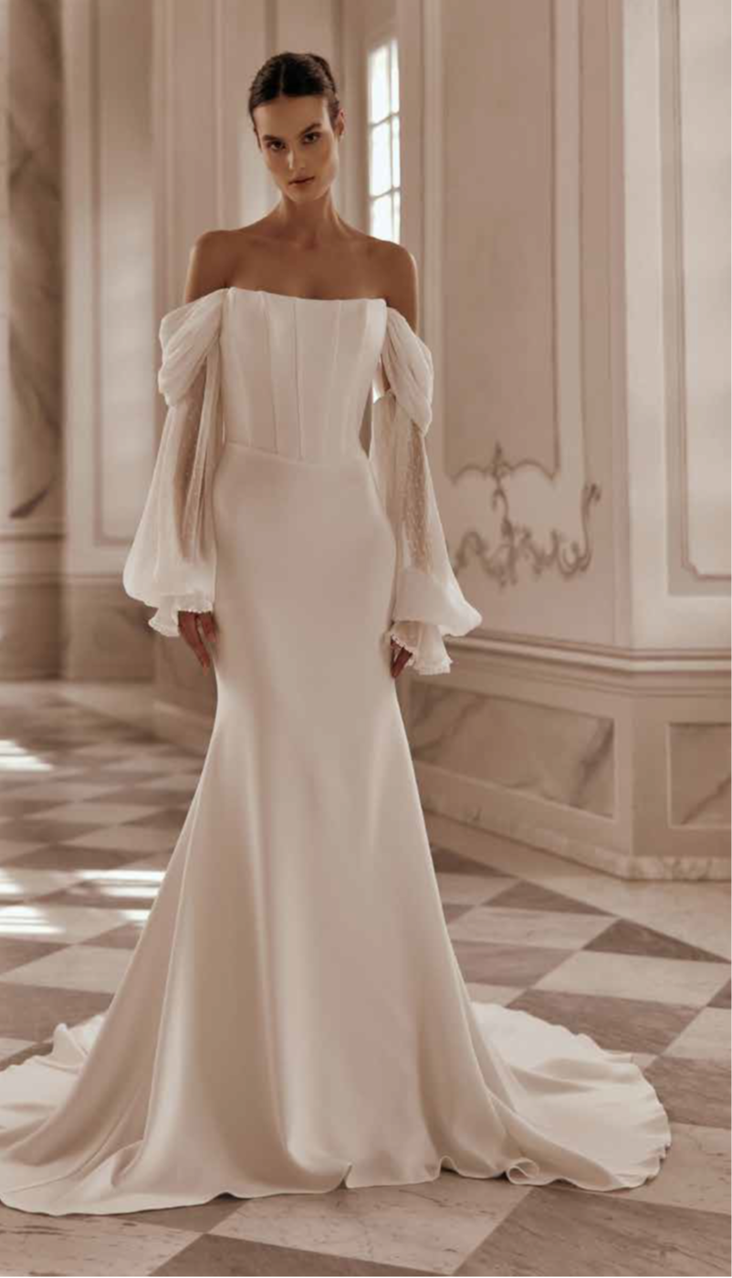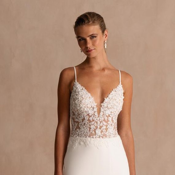Modeca kombiniert moderne Silhouetten mit eleganten, femininen Details. Die Designs wirken zeitgemäß und hochwertig, ideal für Bräute, die klare Formen und raffinierte Akzente lieben.