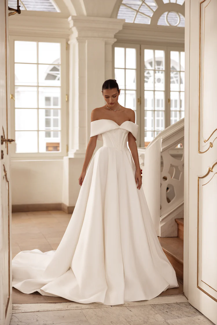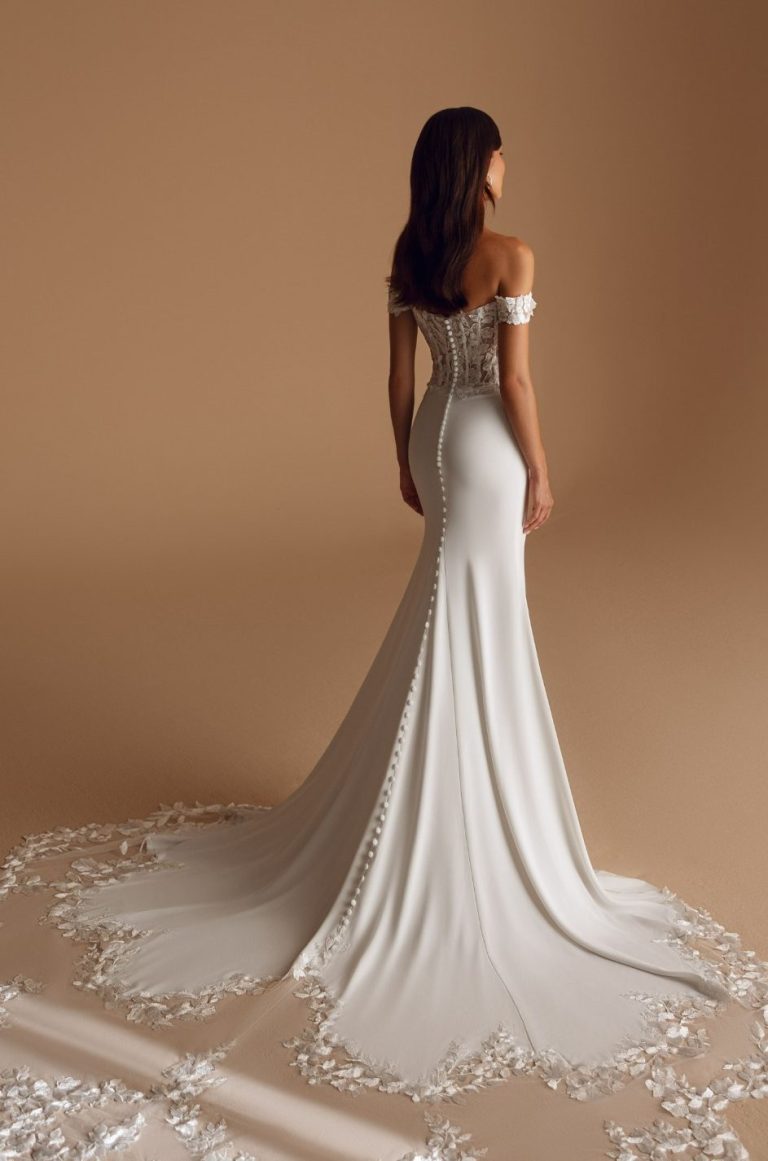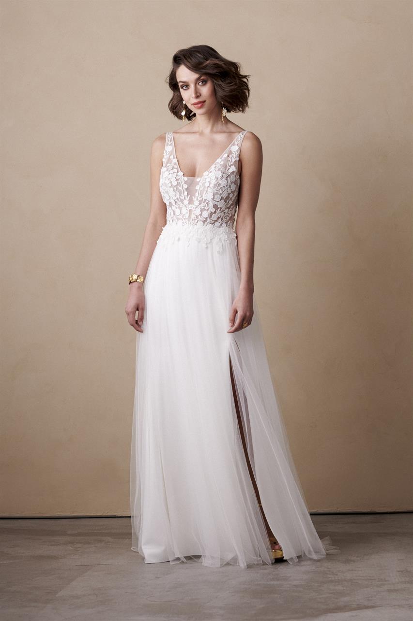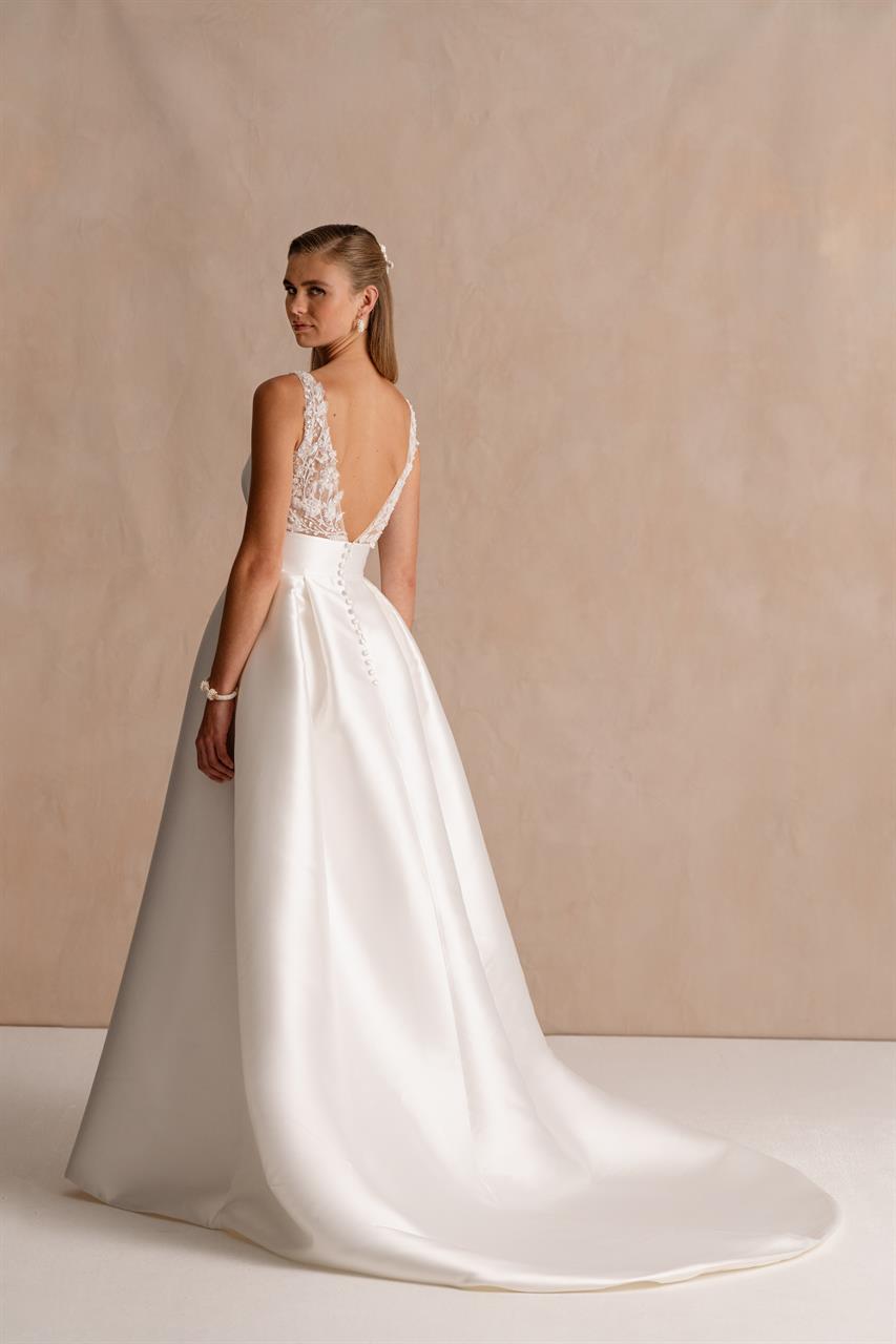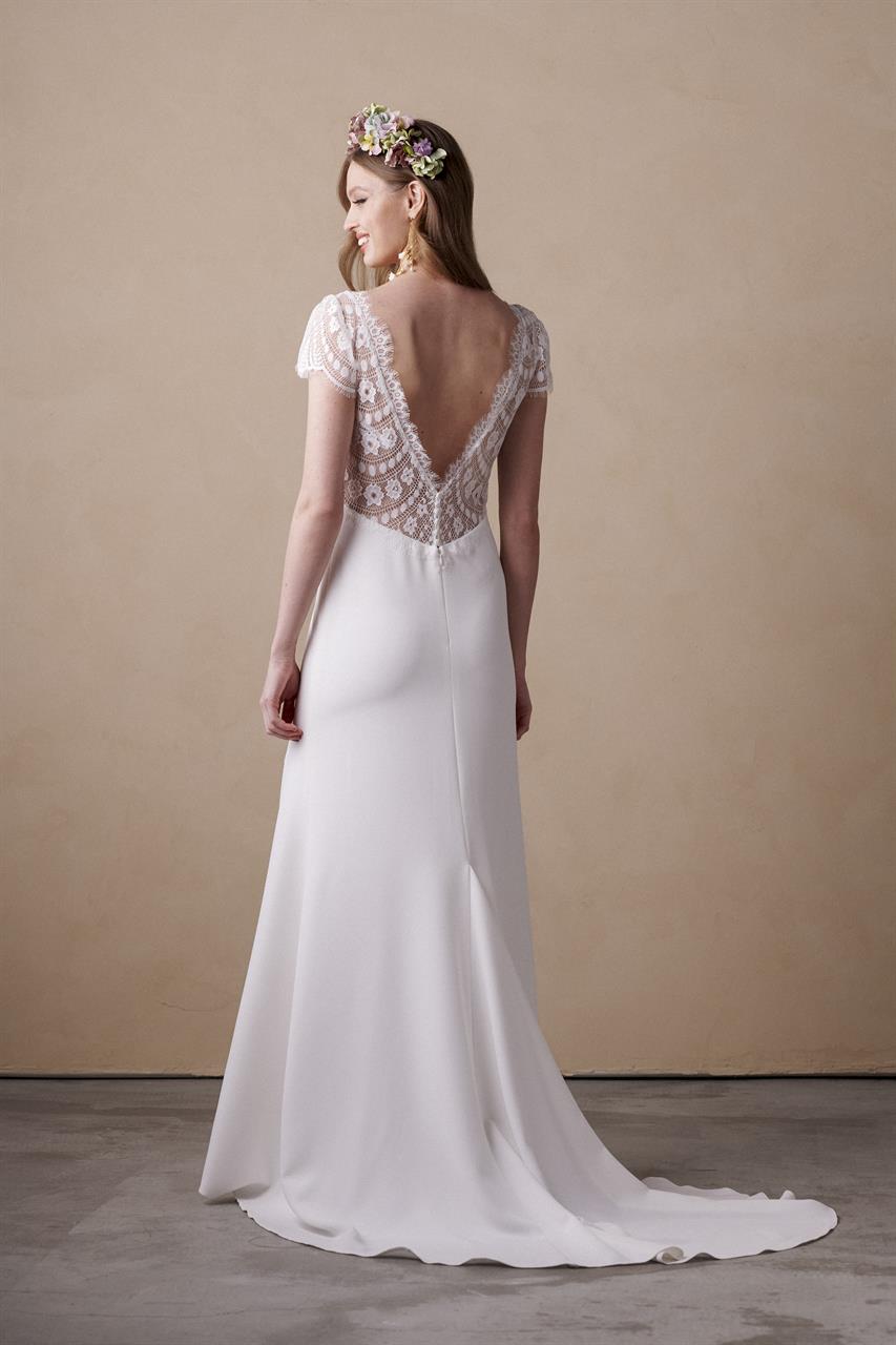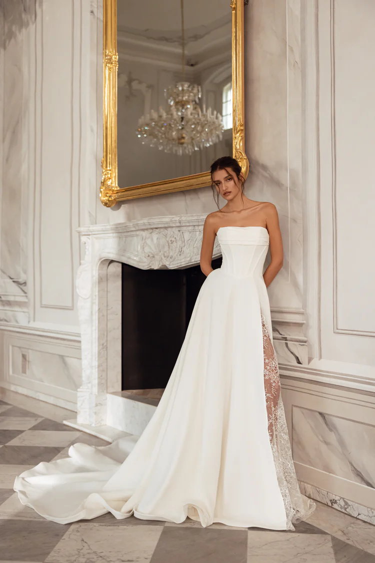 Modeca kombiniert moderne Silhouetten mit eleganten, femininen Details. Die Designs wirken zeitgemäß und hochwertig, ideal für Bräute, die klare Formen und raffinierte Akzente lieben.