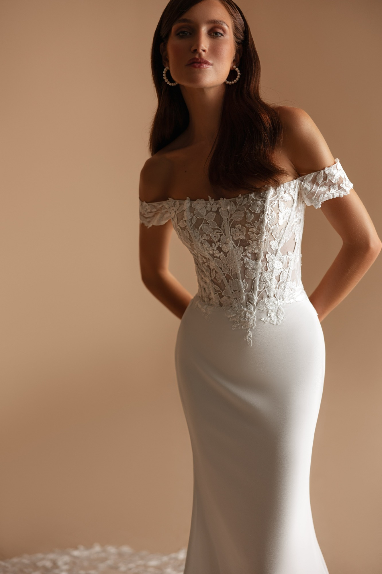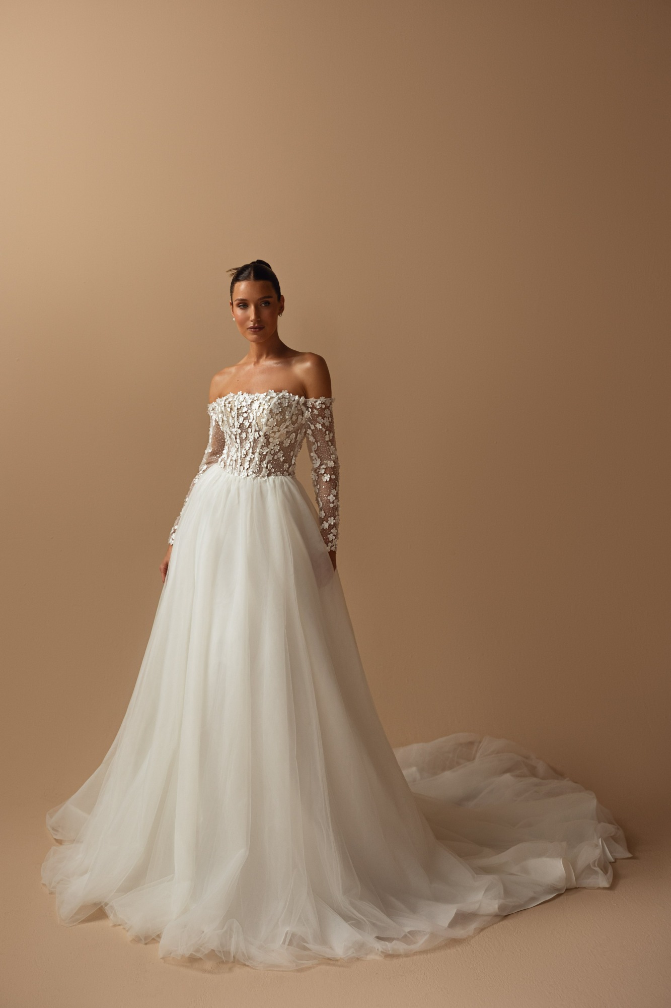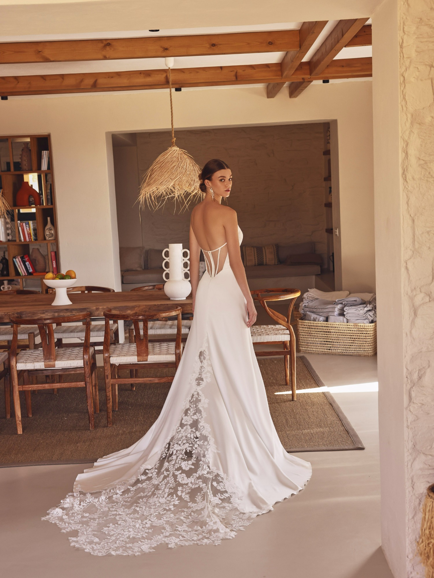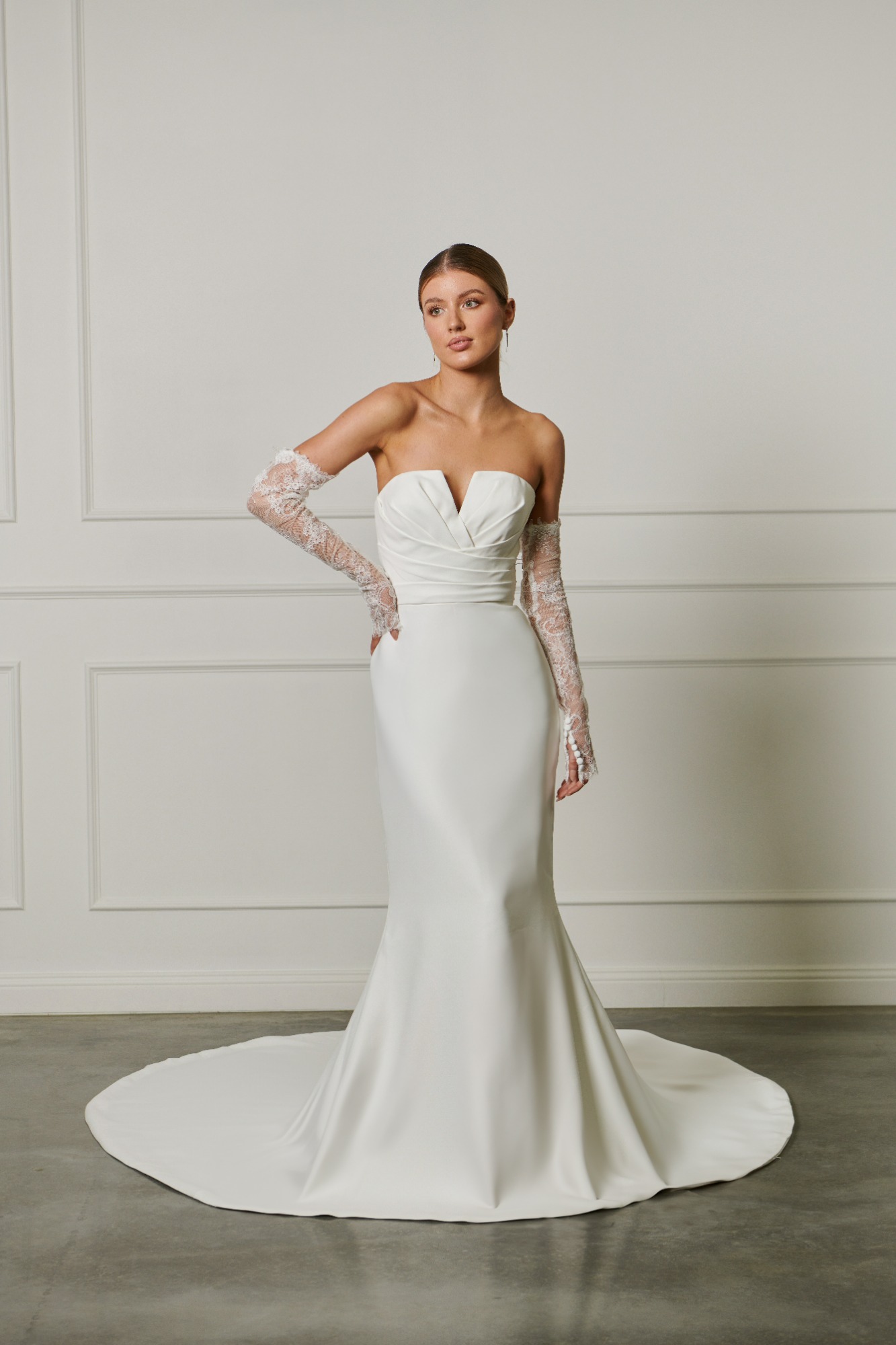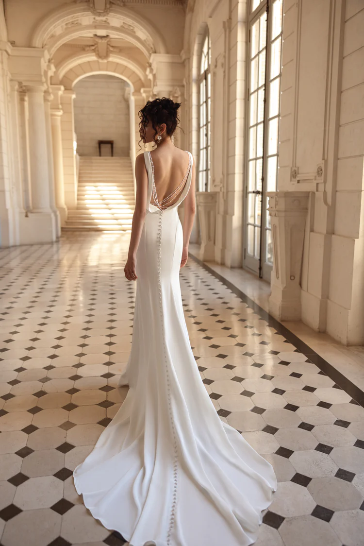 Modeca kombiniert moderne Silhouetten mit eleganten, femininen Details. Die Designs wirken zeitgemäß und hochwertig, ideal für Bräute, die klare Formen und raffinierte Akzente lieben.