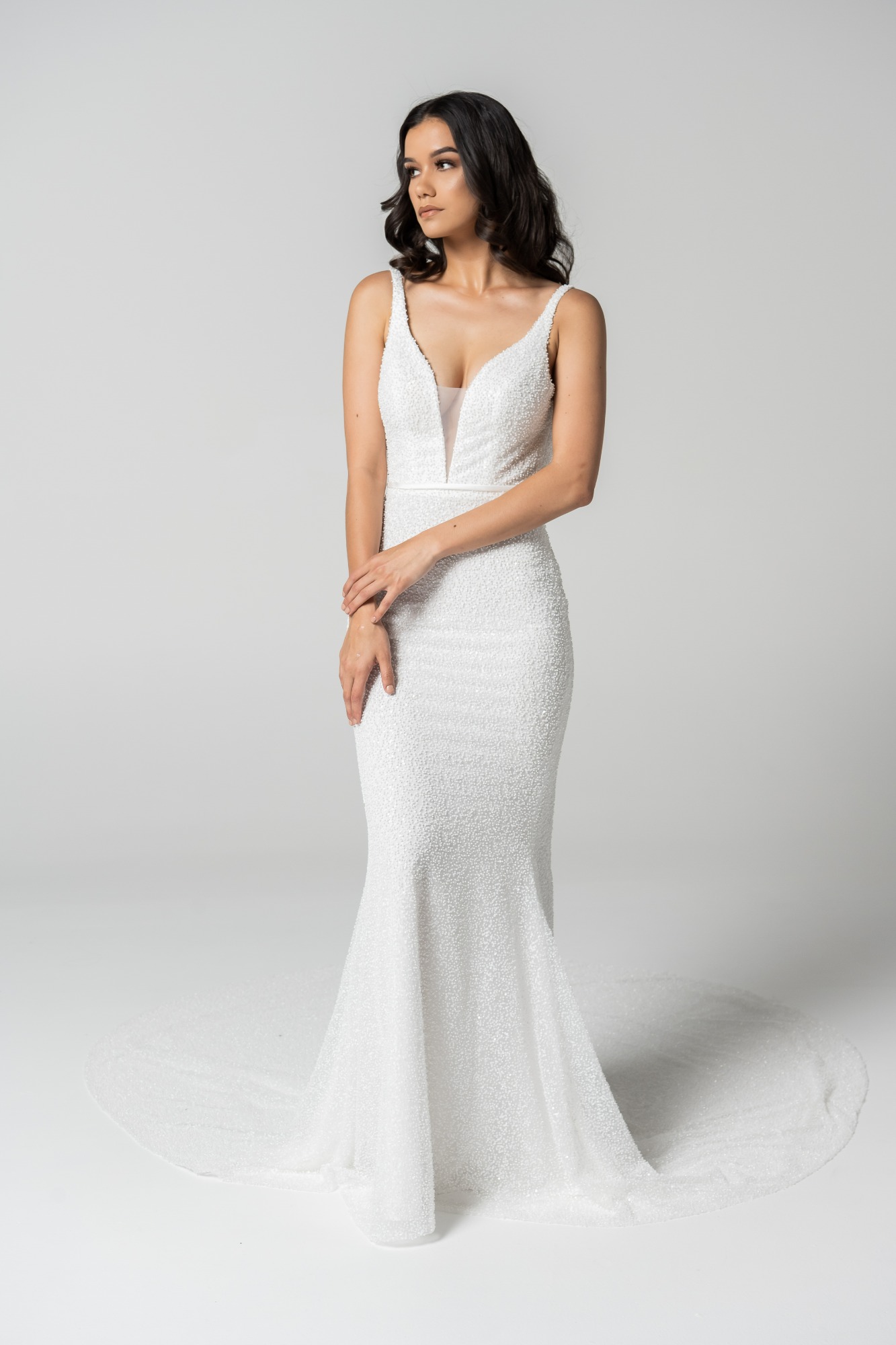 Sehr figurbetonter Schnitt, der sich eng an Brust, Taille und Hüfte anschmiegt und erst unter dem Knie ausläuft. Ideal für Bräute mit ausgeprägter kurviger Silhouette.