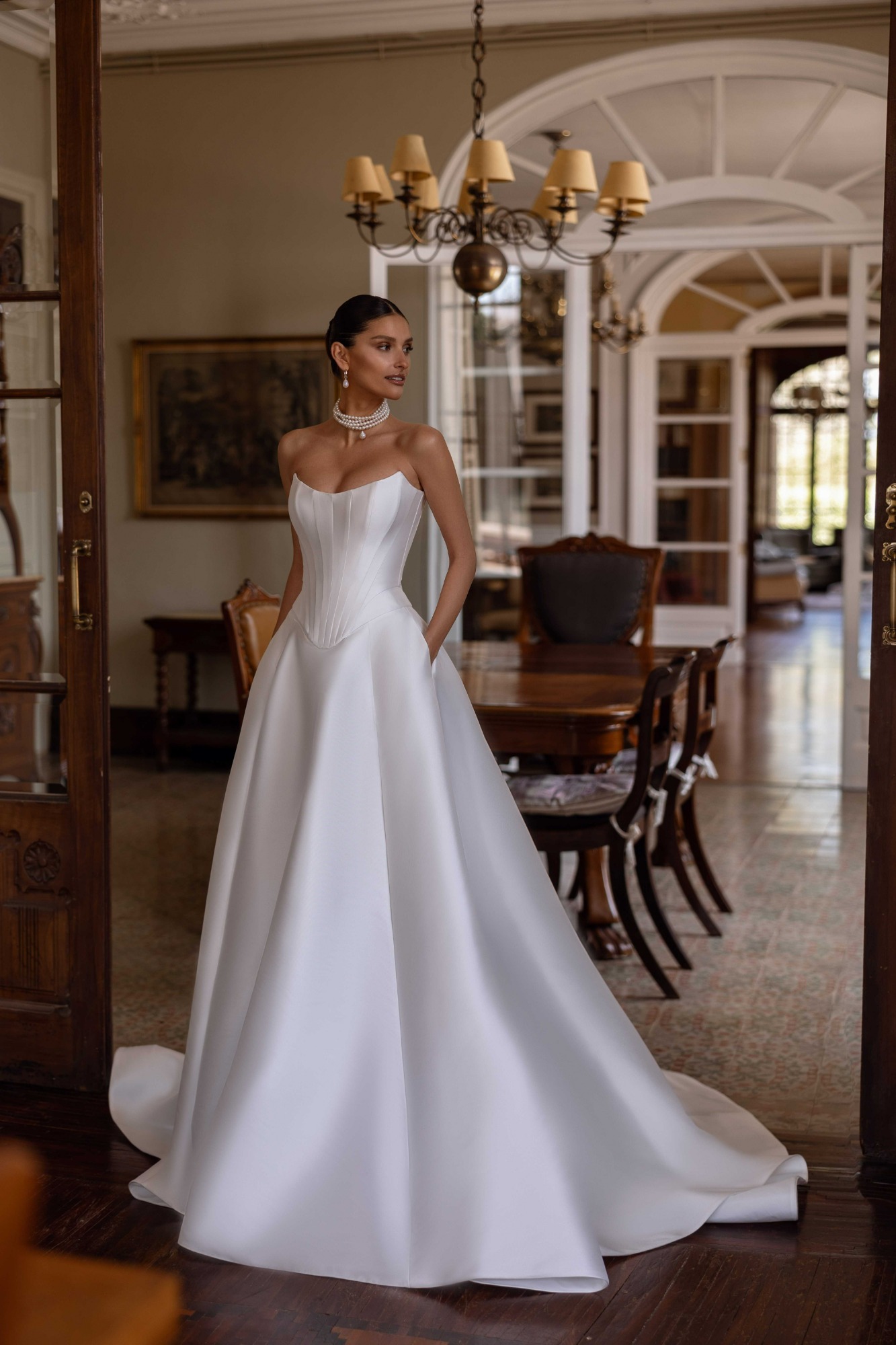 Mit betonter Taille und voluminösem Rock vermittelt dieser Schnitt eine romantische, royale Ausstrahlung.