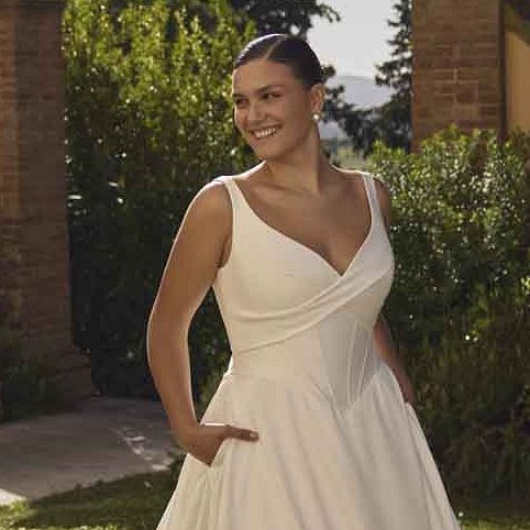 Die Curves by Modeca feiert kurvige Bräute mit schmeichelhaften A-Linie- und Ballkleid-Silhouetten, romantischer Spitze und modernen Vintage-Akzenten. Abnehmbare Ärmel und Spitzen-Details sorgen für Individualität, Komfort und Eleganz.